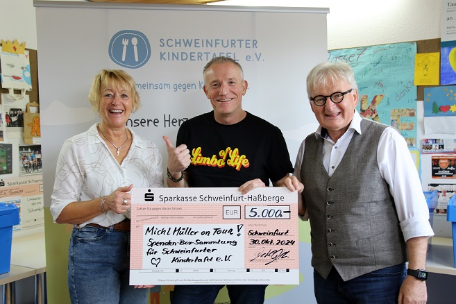 SCHWEINFURT / GARITZ – Ziemlich regelmäßig besucht der aus Garitz bei Bad Kissingen stammende Michl Müller die Schweinfurter Kindertafel. Als ihr Schirmherr sammelt er auf der Tournee Spendengelder. Die jüngste Übergabe bezeichnete Kindertafel-Vorstand Stefan Labus als „wunderschöne Überraschung“.