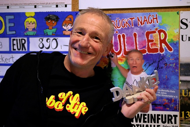 Und weil er alles andere als ein „Dreggsagg“ ist, verspricht Müller am Ende seines Programmes jeweils danach noch Autogramme für und Fotos mit seine(n) Besuchern. Um dann auf seine Rolle bei der Kindertafel hinzuweisen und um eben um Spenden zu bitten. „Da ist es wichtig, wenn die Leute selbst nur ein paar Cent reinwerfen“, sagt er und berichtet von einer Frau, die zwar nicht viel von der Rente übrig hat, weil sie das Pflegeheim ihrer Mutter finanzieren muss. „Aber sie hat dann trotzdem 10 Euro in die Box geworfen.“