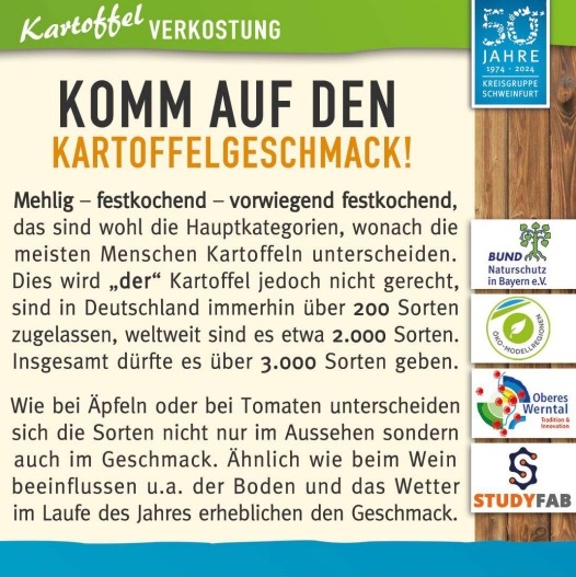 Erleben können Interessierte nun selbst die feinen Geschmacksunterschiede unterschiedlicher Kartoffelsorten. Und zwar am Samstag, den 09.11.2024 von 9:00 Uhr bis 14:00 Uhr in der StudyFAB (Marktplatz/Eingang Keßlergasse) bei der Kartoffelverkostung von Bund Naturschutz und Ökomodellregion Oberes Werntal.