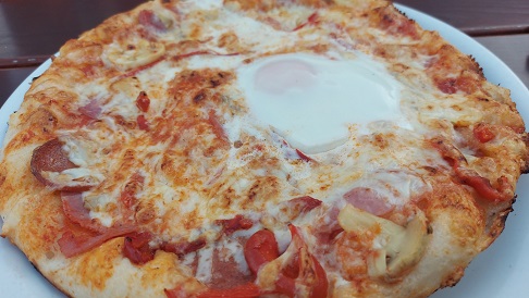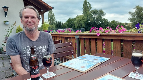 Sondern die Pizza. Und auch die ist überaus lecker. Eine Margarita mit Ei und eine mit Gyros wanderten auf die Runden Teller – und das zu ein paar Schwarzbieren der Brauerei Roth aus Schweinfurt.