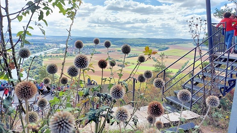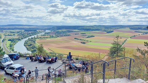 Zunächst ging es ab Stetten, einem Ortsteil von Karlstadt, in die Weinberge. Von einem Wanderparplatz aus sind´s gerade mal 500 Meter zu Fuß zum „terroir f“ – einem magischen Ort in der Weinlage „Stettener Stein“, der an diesem frühen Nachmittag eher ein „Terror“-Aussichtspunkt war. Denn eine Gesellschaft feierte dort ein privates Fest mit ziemlich viel Unruhe.