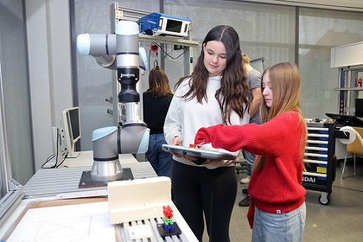 Im Robotiklabor am Campus Konrad Geiger in Schweinfurt beugen sich Laura und Annika über ein Bedien-Panel. Ihr Cobot – ein Roboter-Greifarm – soll kleine Legoklötzchen aufnehmen, über ein Hindernis hinweg transportieren und dahinter auf einem bestimmten Punkt wieder absetzen. „Das ist dieselbe Aufgabe, die Robotik-Studierende im ersten Semester in einem Praktikum machen“, erklärt Labormeister Thomas Glowacz. Die beiden Mädchen sind sichtlich stolz, als das Manöver geklappt hat: „Das haben wir selbst programmiert!“ Der elfjährige Jona ist mit so viel Eifer dabei, dass er eine weitere Aufgabe ganz von vorn programmiert, während die übrigen Kinder einen Malwettbewerb starten und dafür das elektronische Whiteboard nutzen.