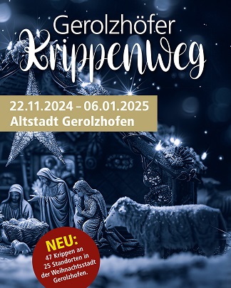 Aufgrund des großen Erfolgs der Vorjahre wird es heuer eine Neuerung geben: Aus der bisherigen „Krippenstraße“ wird in diesem Jahr der „Gerolzhöfer Krippenweg“. Soll heißen: Die von Gerolzhöfer Familien und privaten Sammlern zur Verfügung gestellten Krippen werden heuer nicht nur wie bisher in der Spitalstraße gezeigt, sondern erstmals auch am Marktplatz, in der Breslauer Straße, in der Bürgermeister-Weigand-Straße und in der Marktstraße bis hinunter zur evangelischen Erlöserkirche an der Dreimühlenstraße.
