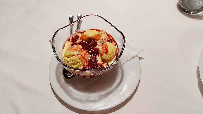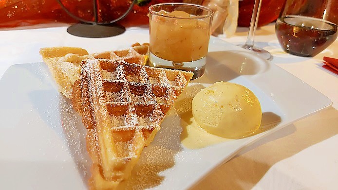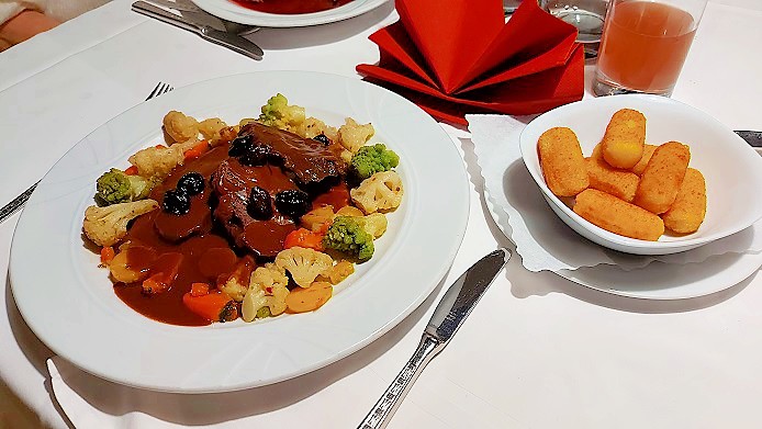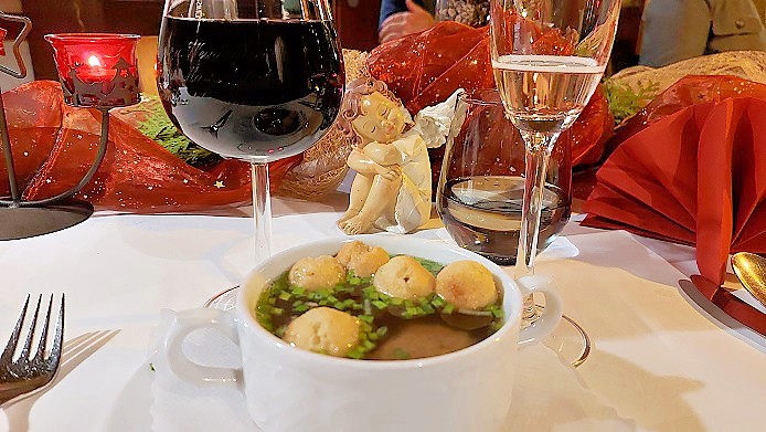 Dort gibt´s ganz feines Essen, die Bilder dürften das beweisen. Auf der Karte stehen als Vorspeise beispielsweise Blaukraut-Gewürz Buttermilch-Cappuccino mit geräucherter Forelle, Waldiges wie das Wildragout toskanisch mit breiten Nudeln und Pilzen oder die Gänsebrust mit Johannisbeersaft-Soße, Apfelblaukraut, Kartoffelklößen mit Maroni-Füllung.