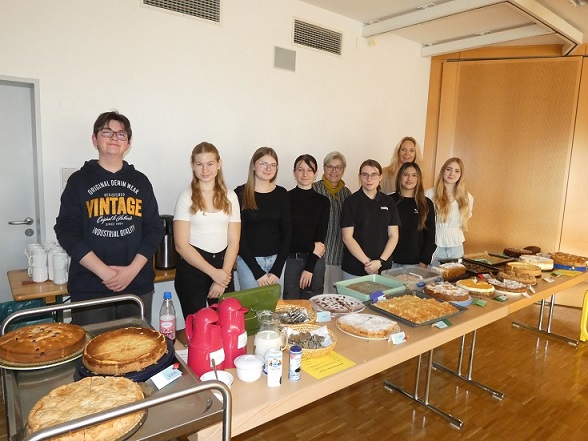 Schülerinnen und Schüler der 9. und 10.Klassen der Mittelschule Gochsheim sorgten mit ihrer Lehrerin Susanne Wehner (Bildmitte) gekonnt dafür, dass die von den Ausstellern gespendeten Kuchen ihre Abnehmer fanden, sehr zur Freude von Rektorin Andrea Orth (hinten rechts).