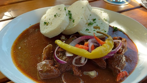 Dann ging´s zum Essen und kamen zu einem hellen Bier folgende vier Gerichte im Lokal von Pavel Märkel auf den Teller – jeweils mit böhmischen Knödeln und einem Salat: Das Szegendiner Gulasch, das Rindergulasch nach böhmischer Art und auch der bömische Sauerbraten mit dem Namen Svickova. Lecker – und der herrliche Biergarten ruft nach einem baldigen Wiedersehen. Nächsten Sommer…