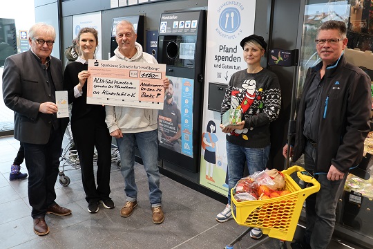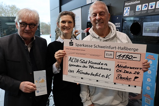 Beim Pressegespräch zur Inbetriebnahme hatten Stefan Labus und sein Team von der Kindertafel einen symbolischen Scheck über 1150 Euro dabei. Das ist der Betrag, den die ALDI SÜD-Kund:innen in den letzten Monaten in den beiden anderen, genannten Filialen durch ihre Bons spendeten. Der Startschuss erfolgte zeitglich auch für ALDI SÜD am Bergl (Einkaufszentrum in der Oskar von Miller-Straße), wo das Spenden nun auch möglich ist.