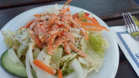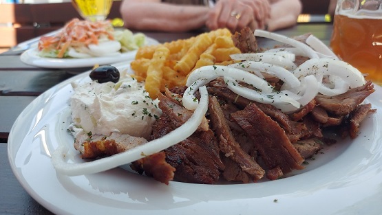 Zwei Mal gab´s Gyros mit Pommes Frites, Tzatziki und einem Beilagensalat. Auch die gefüllten Bifteki wanderten mit Pommes auf den Teller. Und bei Sofi ist auch die Pizza, in dem Fall eine Salami, überaus lecker. Abschließend wurde noch gereimt: „Ich trink Ouzo, was trinkst Du so?“