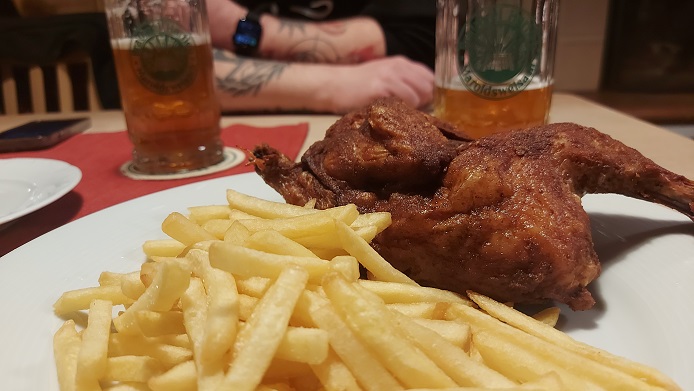 Und so kamen dann eben ein paar Biere auf den Tisch und das halbe Hähnchen mit Pommes Frites, eine der Spezialiäten des Hauses in einer der sicherlich besten und kultigsten Gastwirtschaften Mainfrankens. Wo man sich am 6. Januar richtig gut „Stärk´ antrinken“ kann.