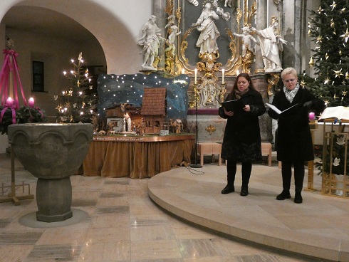 Vor der Weihnachtskrippe sangen die Sopranistinnen Priscilla MacDonald und Michaela Ries mehrmals im Duett. Foto: Walter Ries