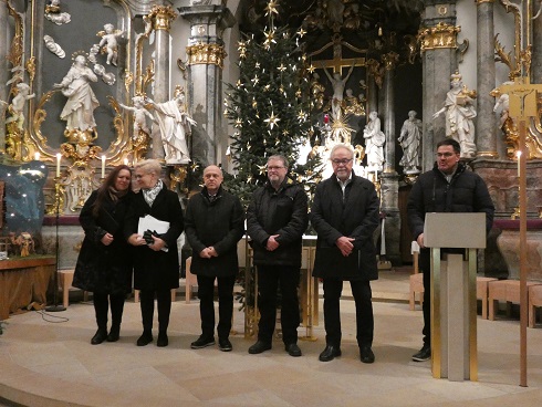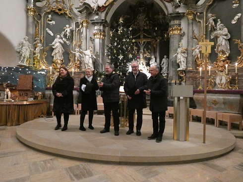 Zunächst luden Pfarrgemeinde und Gesangverein Grettstadt in die festlich geschmückte Pfarrkirche St. Peter und Paul. Das Gotteshaus war restlos gefüllt, als Priscilla MacDonald, Michaela Ries, Stefan Ullrich, Karl-Heinz Gerhardt und Christopher Kuhn ein knapp einstündiges Programm vortrugen. Nach einleitenden Worten Gerhardts boten die Sängerinnen und Sänger am Piano begleitet von Christopher Kuhn „Maria durch ein Dornwald ging“, „Eilet froh, ihr Hirten“ und „Engel lassen laut erschallen“.