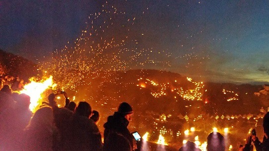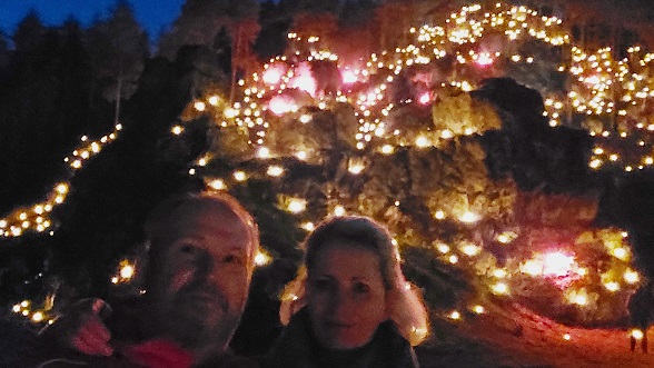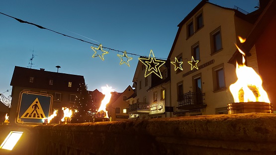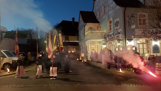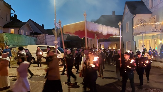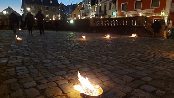 Flammen branntes am Abend des Besuchs: Holzfeuer und bengalische Feuer erleuchteten die Straßen Gößweinsteins. Ein Lichterzug durch die Gassen mit der Basilika als Ausgangs- und Endpunkt war ein bemerkenswertes Erlebnis.