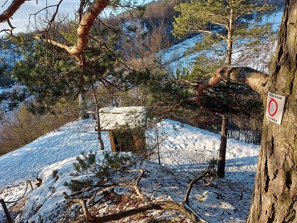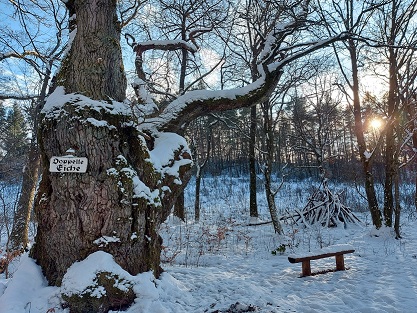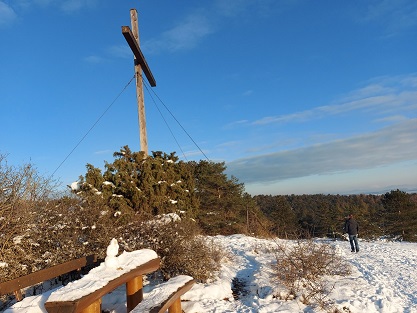 In westlicher Richtung startet die 2014 eingeweihte Rundtour, die es in sich hat. Harmlos geht´s los durch die Natur des „Rauen Steins, der Anstieg auf den Romersbühl ist noch harmlos. In den Wäldern steht die Doppelte Eiche, das erste echte Motiv für Fotoaufnahmen. Dann das erste Highlight der Tour: Der Kletteranstieg auf den Weyershauck, ein wohl eher ziemlich unbekannter Hügel mit einem Kreuz auf dem Gipfel. Nicht schlecht, Herr Specht! Von hier oben, 429 Höhenmeter, auf Ostheim zu blicken und auf die langsam immer tiefer stehende Nachmittagssonne hat den Ausflug bereits gerechtfertigt.