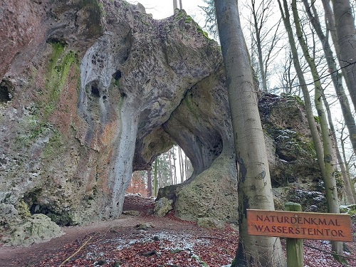 Weiter geht´s im Auto über Gößweinstein und dicht vorbei an Pottenstein. Angesichts zahlreicher Ausflüge früher schon in diese beiden Vorzeige-Haupt-Tourismus-Städte lassen wir sie diesmal links liegen und steuern Betzenstein an, um vorher schon nach Höchstadt (nicht das an der Aisch…) wieder anzuhalten am nächsten Wanderparkplatz: Hier befindet sich der Wasserstein mit dem Wassersteintor. Diesmal ein mächtiger Felsen mit einer Art Vorhöhle auf der Höhe und einem Durchgang. Man kann sich hier wunderbar die Beine vertreten.