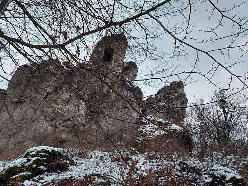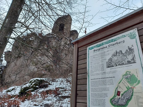 Wir fahren weiter: Stierberg liegt gleich nebenan und bietet mal wieder eine Burgruine auf einem Felsen. Eigentlich ist nur ein Turm übrig geblieben. Doch der wirkt mächtig und gibt einem in Verbindung mit dem kurzen, aber knackigen Aufstieg und dem tollen Ausblick von oben das Gefühl, dass der Abstecher hier her nur wirklich auch notwendig war. So langsam dämmert es nun bereits, das ist der Nachteil an einem Tag Ende Januar und wenn man erst nach dem Mittagessen aufbricht.