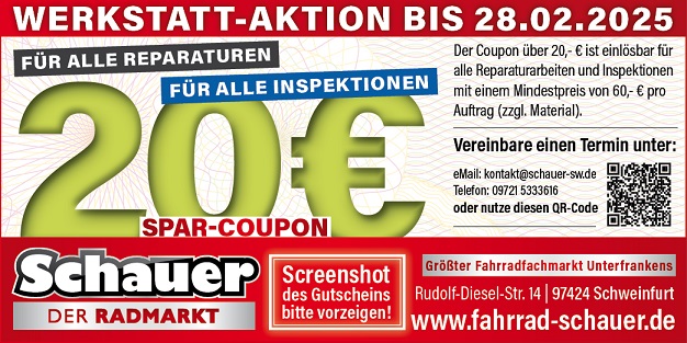 Der Radmarkt Schauer im Schweinfurter Hafen bietet dafür eine Aktion an: Wer im Februar sein Bike zur Reparatur oder Inspektion bringt, kann mit dem unten stehenden Coupon 20 Euro sparen.