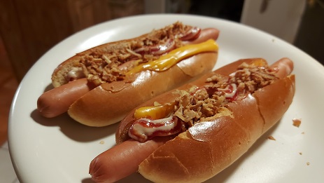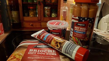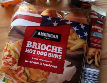 Und die in kurioser Weise in Frankreich hergestellten Hot Dog Buns, sowas wie „Brötchen“ also, nicht wirklich grandios zwar im Vergleich zu denen vom fränkischen Bäcker. Aber wenn schon, denn schon…