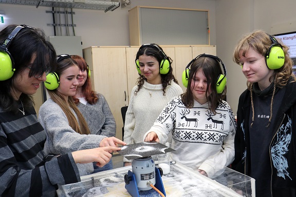 - Im Akustiklabor am Campus Ignaz Schön der THWS können die Schülerinnen selbst sehen, wie Salzkörner auf unterschiedliche Schallwellen reagieren und verschiedene Muster formen (Foto: THWS/Eva Kaupp)