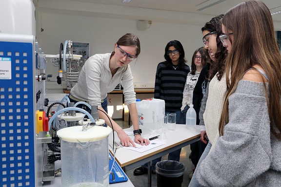 - Technikerin Isabelle Göpfert erarbeitet mit den Schülerinnen ein Experiment im Wasserstoff- und Verfahrenstechniklabor der THWS (Foto: THWS/Eva Kaupp)
