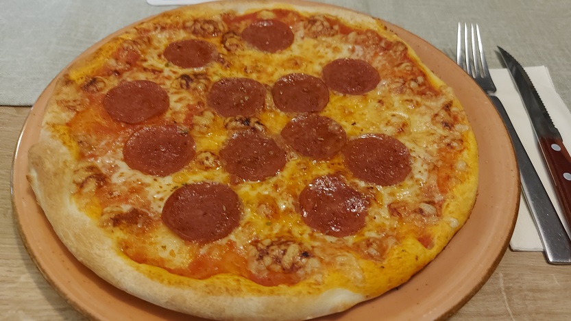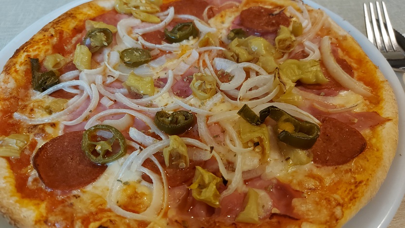 Die beiden Schonunger testeten zu einem alkoholfreien Weißbier und zu einem Dunklen aus Ostheim der Brauerei Streck natürlich auch gleich mal die Küche -Pizza war angesagt, gleich zwei Mal: Eine Piccante und eine Salamino – beste Qualität, wie nicht anders zu erwarten war nach dem, was man schon im Vorfeld immer hörte aus Maßbach. Vom Nebentisch schafften es auch noch die Spaghetti aglio e olio mit auf das Bild.