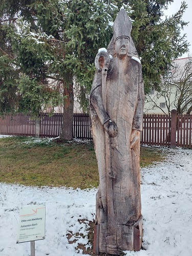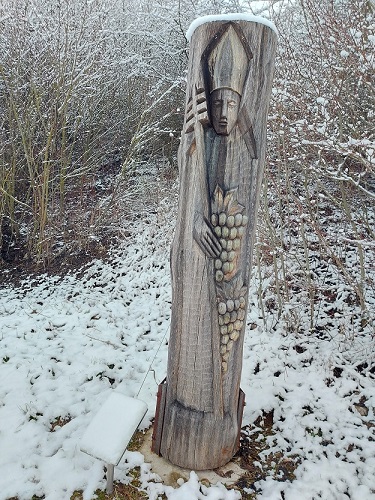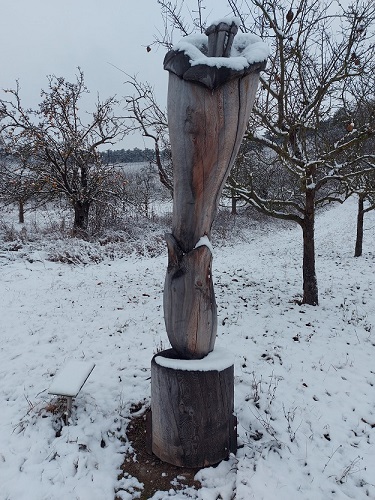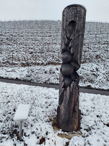 Los geht´s an der Ecke Hauptstraße / Im Schäffthal mit Station 1 an der Mitfahrerbank. Dort steht ein hölzerner Bischof. Von hier an führt der Weg zunächst mal Richtung Ortsausgang Richtung Sulzthal, ehe er nach knapp einem Kilometer nach rechts abbiegt: In die Weinberge über fünf weitere Stationen nach ganz oben, wo „Die Cloud“ als letzte Skulptur natürlich nicht das Ende des Weges bedeutet. Denn der führt ja noch nach unten.