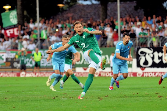 2:0 gewann der FC 05 Anfang September 2024 das erste Duell. Martin Thomann und Michael Dellinger trafen damals. Unser eines Bild zeigt Thomanns Elfmeter zur Führung. Damals noch nicht dabei: Zahlreiche nachverpflichtete Akteure wie der inzwischen 32 Jahre alte Amar Cekic, der von 2019 bis 2022 für die Schnüdel auflief, der danach mit Freiberg (Regionalliga Südwest), Landsberg (Bayernliga Süd) und dem SV Pars Neu-Isenburg (Verbandsliga Hessen) drei weitere Vereine als Zwischenstation ansammelte. Ein klassischer Wandervogel…
