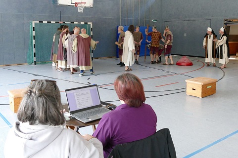 Probenachmittag in der Dammbachtalhalle. Nach und nach treffen die Schauspieler ein. Drei Sprungkästen markieren den improvisierten Bühnenrand. Die Bühne wird erst am 1. April aufgebaut, weil die Halle unter der Woche noch für den Sport genutzt wird. Statt aufwendiger Kulissen bildet ein Handballtor den zufälligen Hintergrund. Doch die Laienschauspieler haben bereits ihre Gewänder an, sind konzentriert dabei, lassen sich von der ungewöhnlichen Umgebung nicht stören. Heute werden die Ölbergszene, der Verrat des Judas und die Gefangennahme Jesu, seine Verspottung durch die römischen Soldaten und die Verleugnung durch Petrus geprobt. Den Abschluss bildet ein Monolog des Verräters Judas. Er hält ihn auf dem Sieben-Meter-Punkt der Turnhalle. Wo die Handballer sonst ihre Freiwürfe machen, verzweifelt heute ein Jünger Jesu, weil ihm klar wird, was er mit seinem Verrat angerichtet hat. Seine Tat, so merkt er jetzt, wird nicht zur Befreiung von den Römern führen, sondern zum Tod eines Freundes.