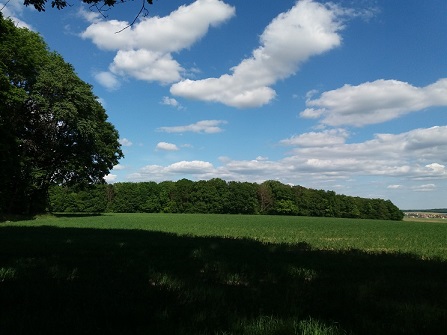 Der sanfte Lerchenberg, eine Jagdhütte, ein Bildstock, eine Bank – in etwa zur Hälfte der Strecke kann man nun langsamer machen und gerne auch ein bisschen verweilen. Ehe es in südlicher Richtung bei einem leichten Zick-Zack-Kurs nun nach und nach wieder in Richtung Ausgangspunkt geht.