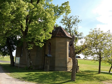Ab der sehenswerten 14 Nothelfer-Kapelle führt ein Kreuzweg zurück runter nach Wülfershausen. Hier endet die Tour – wobei eine Infotafel darauf verweist, dass es nahe Wasserlosen einen Wolfspfotenpfad gibt und in Burghausen eine Hügelgräbertour. Jeweils in ähnlicher Länge. Wir kommen also noch mindestens zwei Mal wieder in diese Gegend…