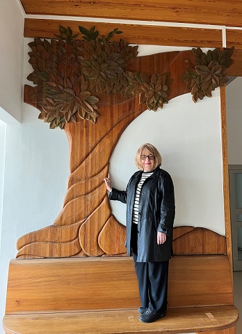 Auf dem Bild: Der „Lebensbaum“ im Eingangsbereich des ehemaligen Krankenhauses Hofheim wird umgepflanzt. Im Schloss Eichelsdorf wird er eine neue Heimat finden. Unser Bild zeigt das Holzrelief mit der Künstlerin Anne-Marie Reiser-Mayerweissflog.