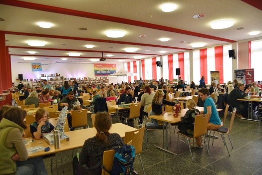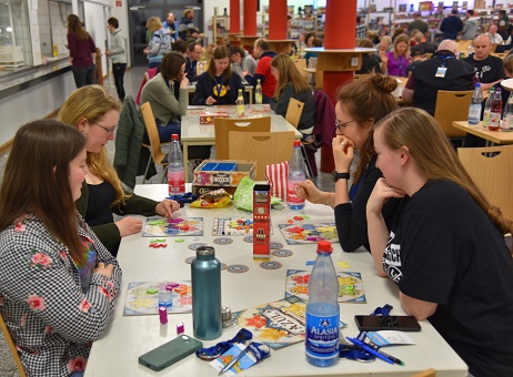 Mit über 1.400 Spielen aller Art waren die beiden Spieleregale gut gefüllt: vom Kindergarten- bis zum Seniorenalter, ob neue Spiele oder Klassiker, Einsteiger- oder Kennerspiele, es war wieder für jeden etwas dabei. Die mit blauen T-Shirts erkenntlichen Spielerklärenden standen zur Verfügung, um auf Wunsch Unterstützung bei unbekannten Spielen zu leisten. Spielenden konnten so häufig Regeln vermittelt werden, ohne dass sie die oft sehr ausführlichen Anleitungen lesen mussten.