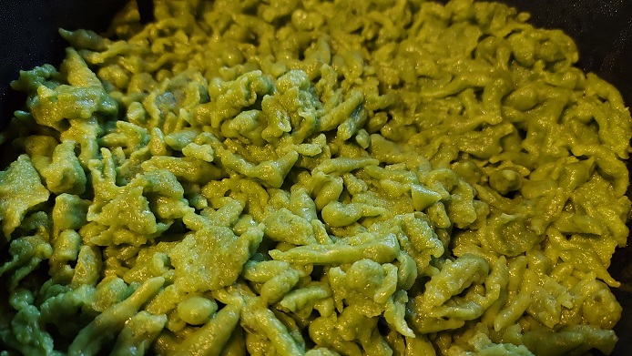 Was es dazu immer wieder gibt: Bärlauch-Spätzle mit Käse, von Petra absolut selbst gemacht, zuvor eigens gesammelt. Ein sowas von leckeres Gericht, relativ schnell gemacht und leicht auch nochmals am nächsten Abend aufwärmbar…