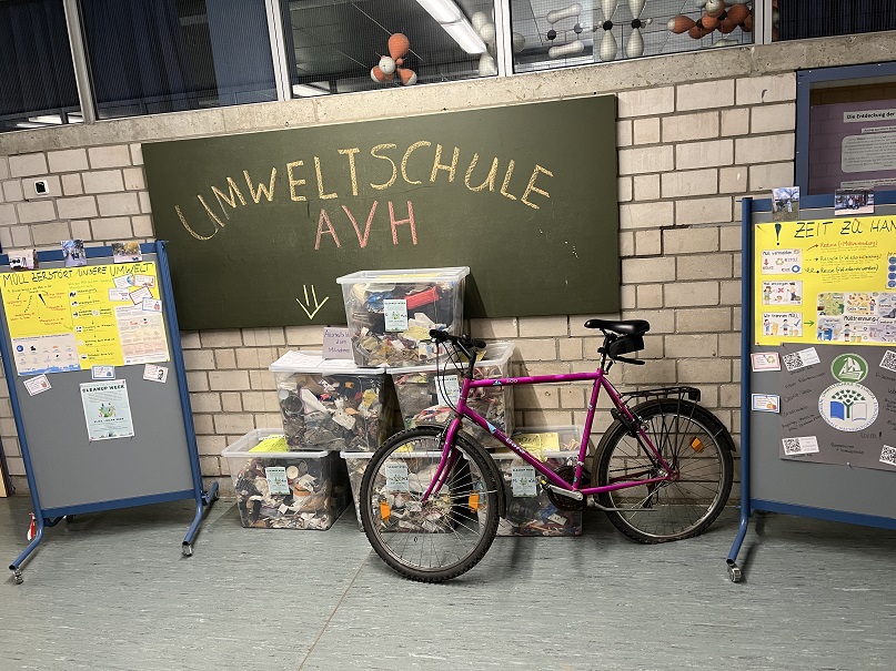 Die Sammelaktion wurde für die Schulgemeinschaft auch in der Folgewoche noch sichtbar gemacht. Die vollen, transparenten Müllboxen und das Fahrrad wurden mit zwei informativen Plakaten im Schulhaus ausgestellt. Sie informieren anschaulich über die Folgen von Umweltverschmutzung, insbesondere durch Mikroplastik, und geben praktische Hinweise für den richtigen Umgang mit Müll – sowohl in der Schule als auch im Alltag.
