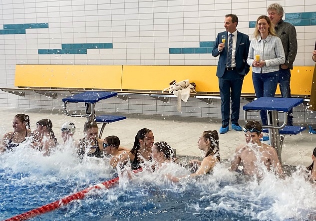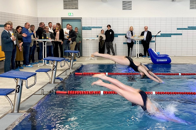 Die Schwimmhalle wurde generalsaniert, Boden, Wände, Decke, Schwimmbecken, Beleuchtung erneuert, die Wasseraufbereitung ausgetauscht, die Lüftungsanlage erneuert und die vorige Beheizung des Bades über statische Heizflächen vollständig zurückgebaut. Zudem wurde das Bestandsbecken aus Beton durch ein Edelstahlbecken ersetzt, das den Vorgaben des Wettkampfschwimmens entspricht. Auch der Brandschutz wurde angepasst. Bürgermeisterin Judith Roth-Jörg freute sich bei der Eröffnung über den „teuren, aber schönen und wichtigen Spaß.“ Sie dankte den Stadträtinnen und Stadträten, die sich trotz Diskussionen für die Sanierung des Bades einhellig ausgesprochen hatten, aber auch den Mitarbeitenden des Fachbereichs Schule. „Jeder Eingriff in den Bestand bringt Widrigkeiten und veränderte Bauvorschriften mit. All dies war natürlich auch hier zu beachten und ich finde, die Sanierung wurde mit Bravour gelöst.“ Architekt Karlheinz Keicher sprach von einem herausfordernden und zeitintensiven Bauvorhaben und spendierte den Schwimmerinnen und Schwimmern einen Wassersessel. Nach der kirchlichen Segnung des Bades als „Ort voller Leben, Mut und Vertrauen, der Achtung und Hilfsbereitschaft“ durften die ersten Schülerinnen und Schüler das neue Schwimmbad noch während der Anwesenheit der Gäste testen und nutzten die Wasserfläche ausgiebig zum Schwimmen, Springen, Tauchen und Planschen.