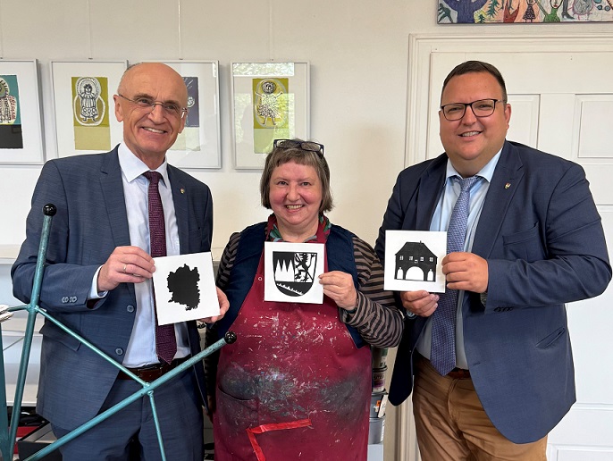 Stolz präsentieren Landrat Wilhelm Schneider und Bürgermeister Alexander Bergmann ihre Werke, die in der Druckwerkstatt von Jannina Hector entstanden sind und das Gemeinschaftsprojekt „Kunst setzt Zeichen“ bereichern.