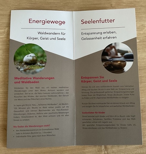 Auch auf dem Flyer steht, was Elke Schaller anbietet. Wer hat denn mal Lust auf ein Waldwandern? Drei Stunden, um im Wald sogar zu „baden“, um die Natur bewusst wahrzunehmen.