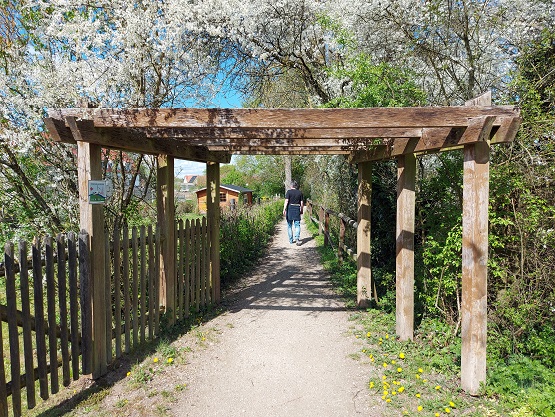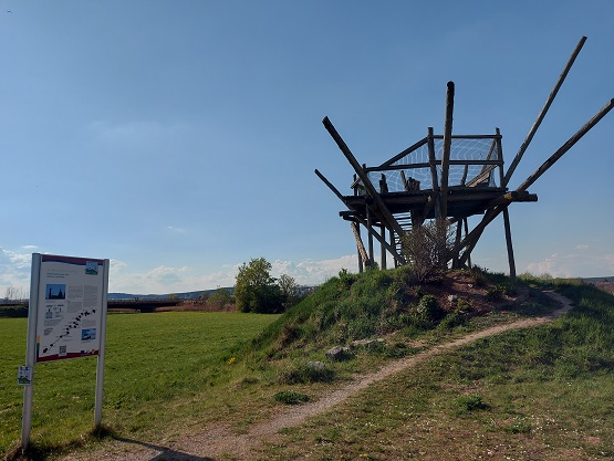 Über Wiesen und Wege dazwischen geht´s weiter bis zu einer Vogel-Beobachtungs-Stadion und vielen Weihern am südlichsten Punkt des Rundweges. Auf dem Weg zurück bietet der nächste Ort Demantsfürth zwei weitere Highlights: Das Storchennest als kleinen Aussichtsturm und zuvor schon die Hinweise nebst Bahnhof zur alten Linie: Bis 1993 fuhr eine Eisenbahn von Neustadt an der Aisch die rund 15 Kilometer bis Demantsfürth. Das waren noch Zeiten…