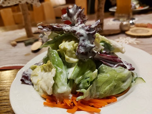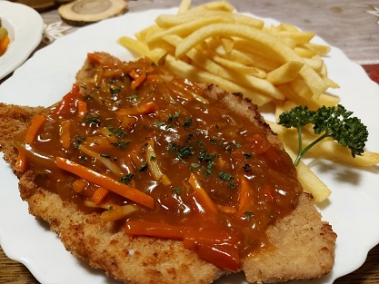 Begleiter Andreas testete die vegatarische Seite der Speisekarte: Die Linsengemüse-Bratlinge mit den Süßkartoffel-Pommes, dem Knoblauch-Kräuter-Dip und einen Beilagensalat. Absolut okay, wenn man so etwas anbietet. Außerdem standen – ganz klassisch – ein Wiener und ein Paprikaschnitzel auf dem Wunschzettel.