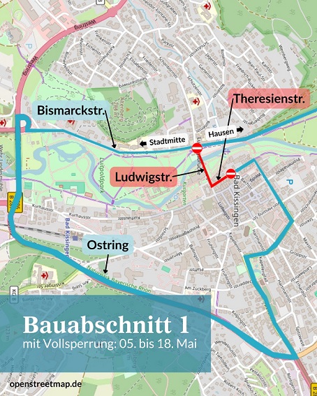 Von der Ecke Ludwigstraße/Theresienstraße aus ist die Zufahrt in die Fußgängerzone und den Bereich Am Kurgarten vier Wochen lang nicht möglich. Anwohner werden über mögliche Einschränkungen und Sonderregelungen informiert. Die Schranke in der Bismarckstraße Höhe Seniorenheim Rosenhof wird für die gesamte Zeit der Bauarbeiten geöffnet.