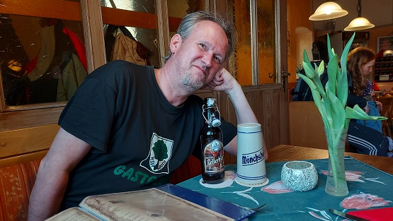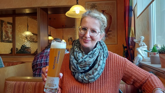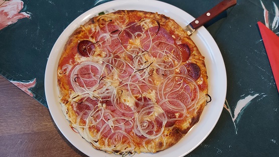 Diesmal war an einem Samstag um 17 Uhr das Lokal komplett voll. Einen kleinen Tisch ergatterten die beiden Schonunger noch und freuten sich zu ein paar Kellerbieren der Mönchshof aus Kulmbach und einem alkoholfreien Kapuziner Weißbier über einmal die Pizza Mary und dann noch die zwiebelige Pizza Calabrese.