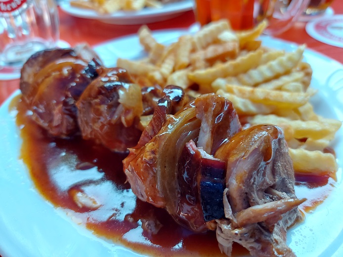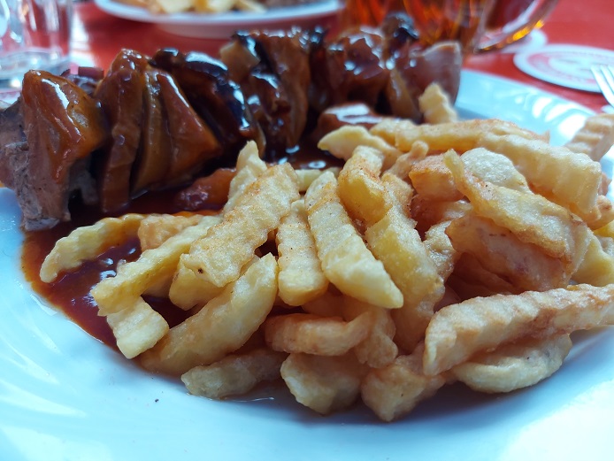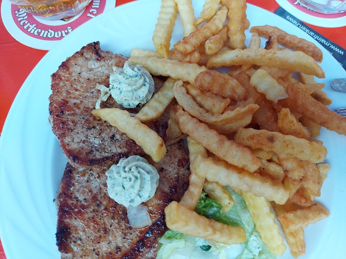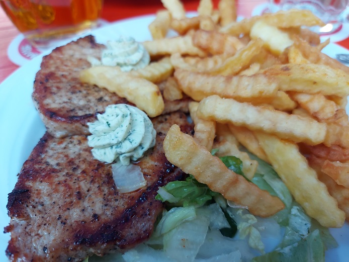 Jeweils zu Pommes Frites gab es mal wieder diesen mächtigen Fleischspieß nach Schaschlik-Art sowie die Natursteaks mit Kräuterbutter. Beides wahnsinnig lecker – und das Preis-Leistungs-Verhältnis rechtfertigt immer wieder einen Besuch.