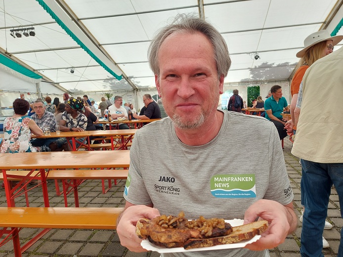 Um sich vor danach folgenden drei Fußballspielen (alle Berichte folgen noch auf www.mainfranken.news) zu stärken mit dem wohl am besten gewürzten Steak aller Zeiten. Auf Brot, mit geschmorten Zwiebeln – na, wenn das nicht lecker ist!