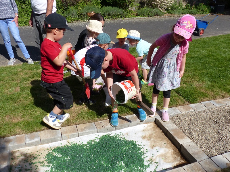 Kaum waren Hackschnitzel, Kieselsteine, Holzpfähle, Rindenmulch, Sand, Glas und vieles andere angeliefert, verteilten die fleißigen Helferlein die Materialien in den fast dreißig Feldern des Barfußpfades und der Sinneskreise.
