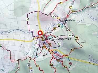 Fast bis zum Fußballplatz führt der Weg nun, ehe wir nach links abbiegen und vor dem anstregendsten Teil stehen. Wieder geht´s nach oben, diesmal erstmals durch den Wald, wo der Weg teilweise ziemlich matschig ist. Es dauert nicht lange – und wir laufen schon wieder an Weinbergen entlang. Aussichtspunkt zwei befindet sich direkt oberhalb von Michelau. Ein Abkürzen wäre nun möglich.