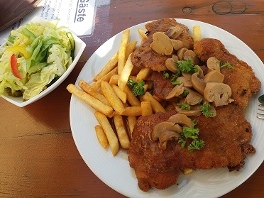 Wir entschieden uns für danach zur Einkehr ins Prüßberger Gasthaus Vollburg der Weinbau-Familie Zinner mit dem schönen Biergarten, leckeren Getränken aus Weismain und aus dem Eigenanbau. Bestes Preis-Leistungs-Verhältnis, was auch auf die Jägerschnitzel zutrifft. In der Region kann man generell wunderbar einkehren, beispielsweise im Hexenhäusle im Ortsteil Neuhausen gleich hinter Prüßberg, in Hundelshausen im Gasthaus Bedenk oder in Altmannsdorf, wo es mit den Gasthäusern zum Falkenberg und zum Zabelstein gleich zwei tolle Wirtshäuser gibt.