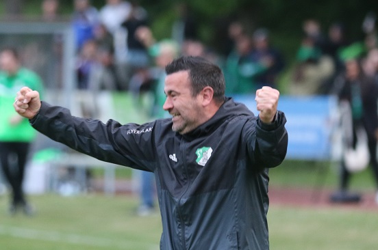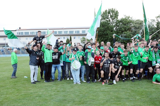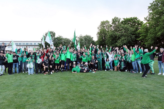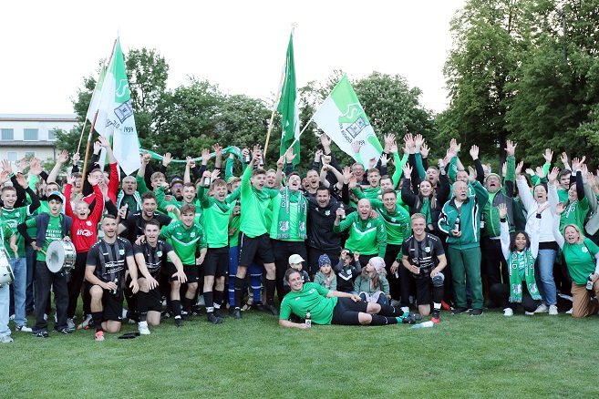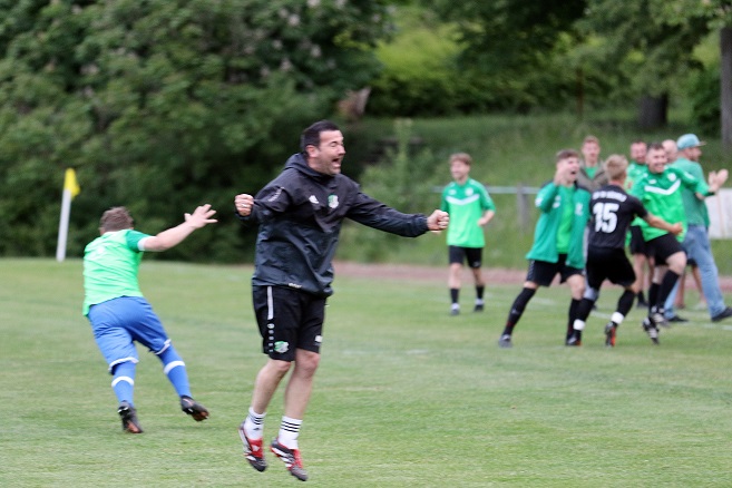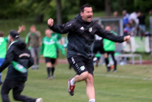 Und der sich nochmal daran erinnert, dass er vor erst drei Jahren in Büchold zusagte, als das Team noch in der A-Klasse spielte. Am Bezirksligator anzuklopfen, das ist an sich unfassbar. „Sowas hab´ ich noch nie erlebt…!“, das sagte Wolf aber schon im letzten November, als seine Mannschaft in Unterpiesheim durch Fabian Schneider in der 101. (!) Minute das Siegtor zum 2:1 erzielte. Heute weiß man: Ohne dem wäre das, was sich in Grettstadt nun ereignete, nicht passiert. Die Grundlage für eine Riesenfeier der grün-weißen Dorfbomber noch auf dem Platz und später nach der Heimkehr im Bücholder Sportheim. Ob das noch steht?