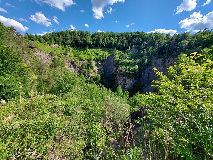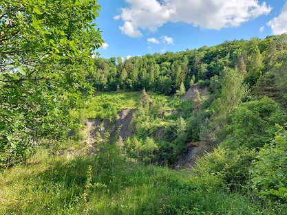 Mit rund 6,5 Kilometern ist oben der beschilderte Rundweg „Kraterrunde“ zu empfehlen, der sich auch auf 3;5 Kilometer abkürzen lässt, wenn man auf das unbewaldete Plateau verzichten will. Wichtigstes Ziel der kleinen Wanderung ist ohnehin der ehemalige Steinbruch.