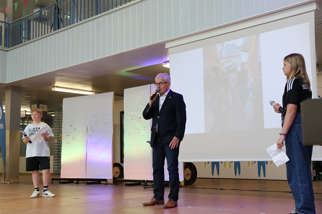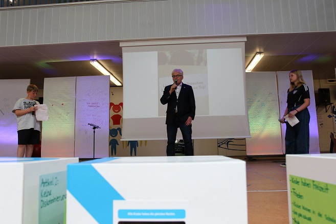 Stefan Labus bedankte sich für die Bereitschaft, die Bühne für die Kindertafel zu öffnen, bei der Schulleiterin, Oberstudiendirektorin Gabriele Seelmann, sowie bei den Lehrkräften Cynthia und Frank Pfeffermann, federführend im Organisationsteam des Projektes „Kinderrechte“. Und natürlich bei den mitmachenden Schülerinnen und Schülern.