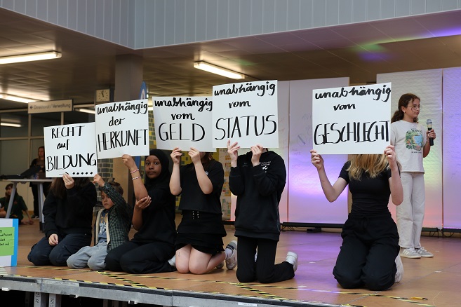 Workshops und Denkanstöße und letztlich eine abschließende Bühnenshow sollten den Schülerinnen und Schülern verdeutlichen, dass Akzeptanz, Toleranz, Hilfsbereitschaft oder Respekt wichtige Werte sind. Und dass Kinder laut der UN-Kinderrechtskonvention von 1989 eigentlich weltweit ein Recht haben auf beispielsweise Bildung, Gleichbehandlung oder Schutz vor Gewalt, Missbrauch oder Diskriminierung.