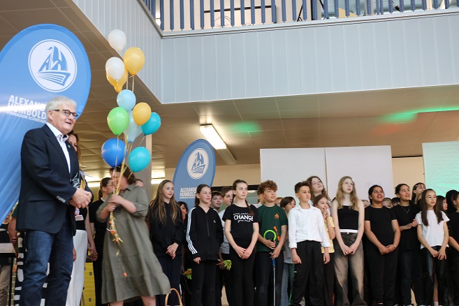 Labus brachte seine Kindertafel-Botschafterin Steffi List mit. Die Musikerin sorgte für rockige und poppige Gesangseinlagen wie am Ende mit dem Lied „99 Luftballons“, als in der Aula des Gymnasiums zum Abschluss des Projekttages selbige in die Luft stiegen.